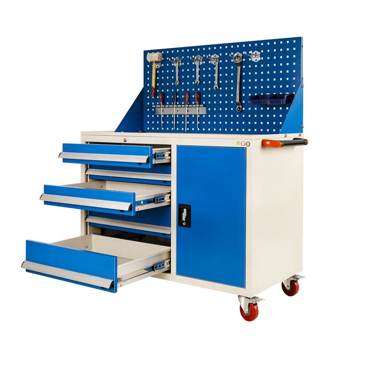 2.Smart Storage Design. Five drawers with adjustable dividers and a lockable side cabinet. Pegboard panel keeps tools visible and easy to reach.