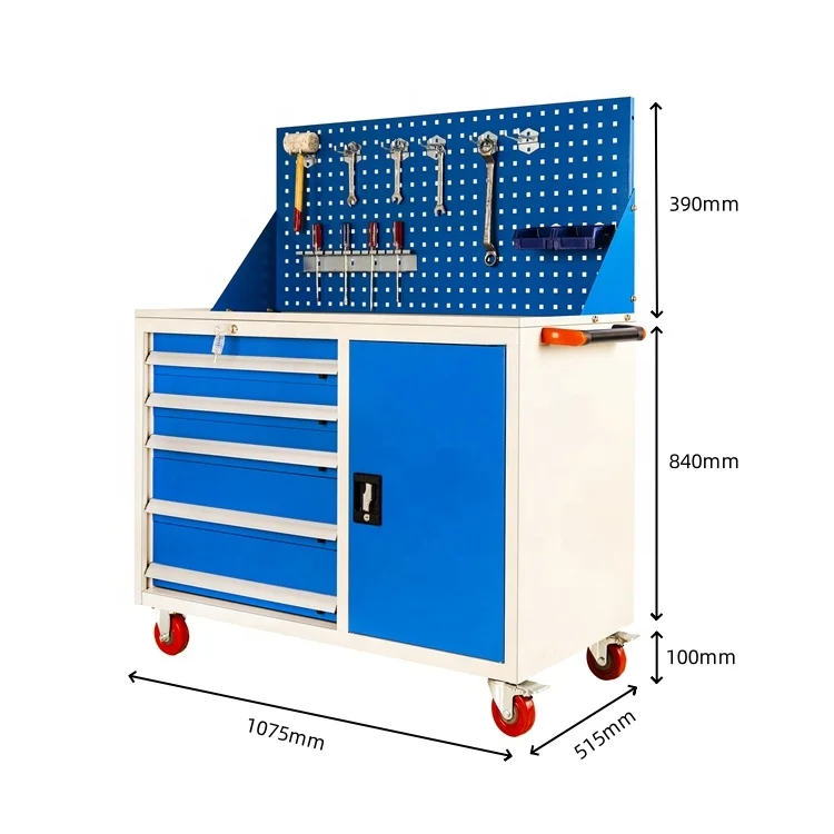 The tool trolley features a smart storage design that maximizes organization and accessibility. Equipped with five drawers, the unit allows users to store a variety of tools, parts, and accessories. The adjustable dividers in the drawers offer flexibility for different types of tools, ensuring that everything has its designated place. A lockable side cabinet provides additional secure storage for valuable tools and items. The integrated pegboard panel allows for efficient hanging and quick access to frequently used tools, keeping everything visible and easy to reach.